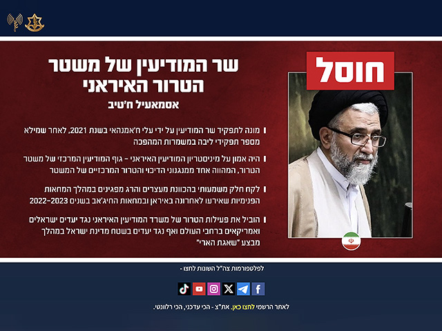 В результате точечного удара ВВС по цели в Тегеране, нанесенного по точной разведывательной информации АМАНа, в ночь на среду был ликвидирован министр разведки террористического режима Ирана Эсмаил Хатиб, сообщает пресс-служба Армии обороны Израиля.