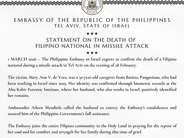 В сообщении подчеркивается, что она стала первой филиппинкой, погибшей в результате продолжающегося конфликта на Ближнем Востоке. Посол Айлин Мендиола позвонила находящемуся в Израиле мужу погибшей женщины, чтобы выразить соболезнования и заверить, что правительство Филиппин окажет ему необходимую помощь.