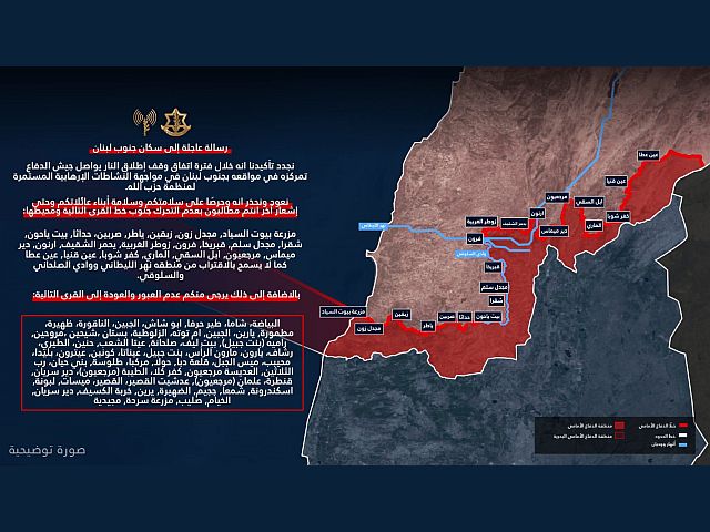 В сообщении также указан район возможных боевых действий и перечислены десятки деревень на юге Ливана, в которые запрещено возвращаться до специального уведомления.