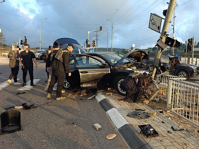 После аварии автомобиль врезался в столб. Водитель из подразделения "Маген", находившийся в машине один, получил легкие травмы.