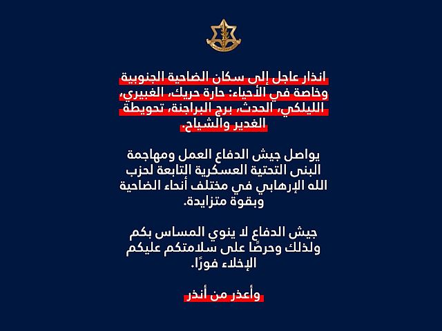 Жителям районов Харет-Хрейк, Гобейри, Аль-Лейлаки, Аль-Хадас, Бурдж аль-Бараджне, Тахвитат аль-Гадир и Шиях предписано немедленно эвакуироваться.