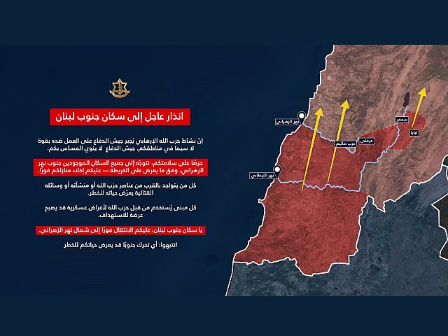 Пресс-служба ЦАХАЛа на арабском языке опубликовала повторное предупреждение к жителям Ливана, находящимся к югу от реки Захрани. "Террористическая деятельность "Хизбаллы" вынуждает ЦАХАЛ действовать против нее в этом районе с применением силы, – сказано в этом сообщении. – ЦАХАЛ не намерен причинять вам вред. Ради вашей безопасности мы вновь призываем вас немедленно покинуть свои дома и немедленно направиться к северу от реки Захрани".