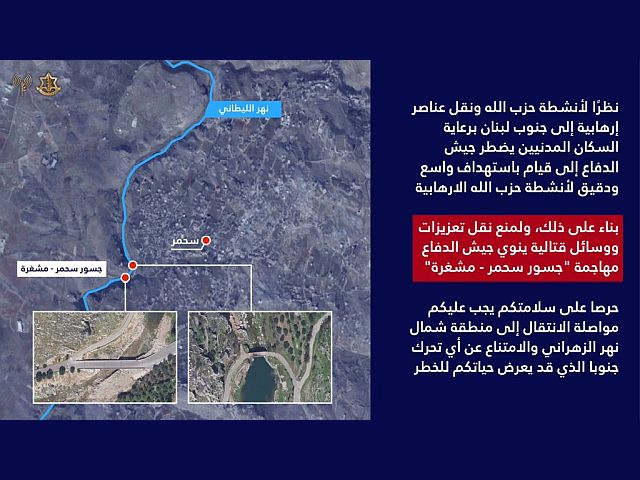 "Чтобы предотвратить переброску подкреплений и боевых средств "Хизбаллы" на юг Ливана, ЦАХАЛ нанесет удары по двум мостам через реку Литани – Сахмар и Машгара. Ради вашей безопасности вы должны продолжать перемещаться в район к северу от реки Захрани и воздерживаться от любого движения на юг, которое может поставить вашу жизнь под угрозу".