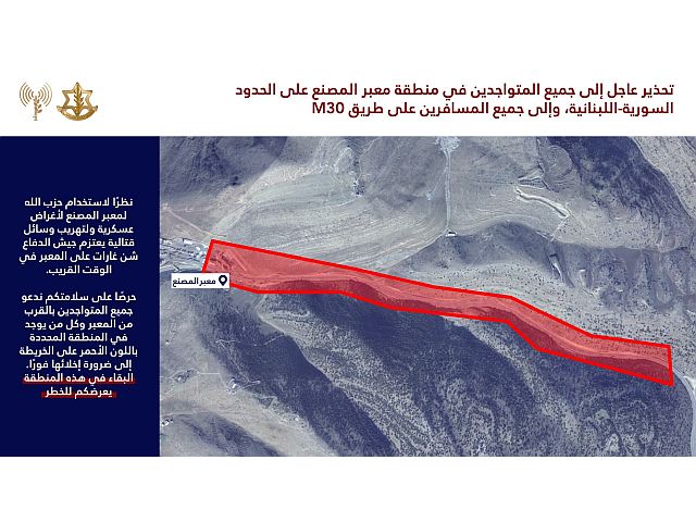 Пресс-служба ЦАХАЛа на арабском языке опубликовала срочное предупреждение для всех, кто находится в районе КПП "Маснаа" на сирийско-ливанской границе ("Джейдат-Ябус" со стороны Сирии) и на подъездной дороге к нему на ливанской территории.