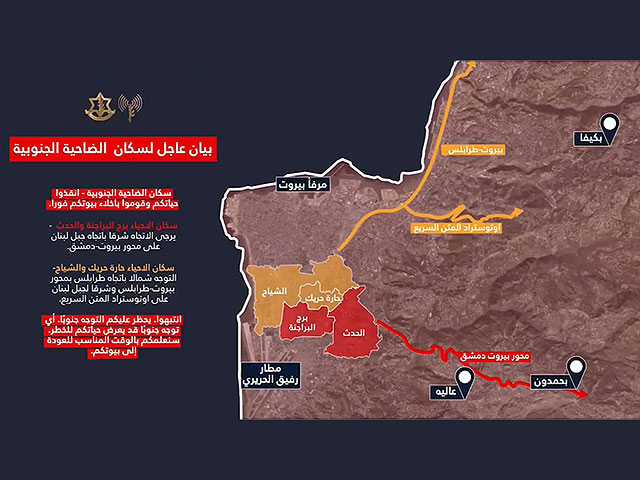 "Жители районов Бурдж аль-Бараджнэ и Аль-Хадат, вы должны немедленно покинуть свои дома и двигаться на восток в направлении Бейрут-Дамаск, – сказано в этом сообщении. – Жители районов Харет-Хрейк и Аш-Шиах должны переместиться на север в сторону Триполи по трассе Бейрут-Триполи и на восток по шоссе Аль-Матан. Категорически запрещено двигаться на юг! Любое движение на юг может подвергнуть вашу жизнь опасности".