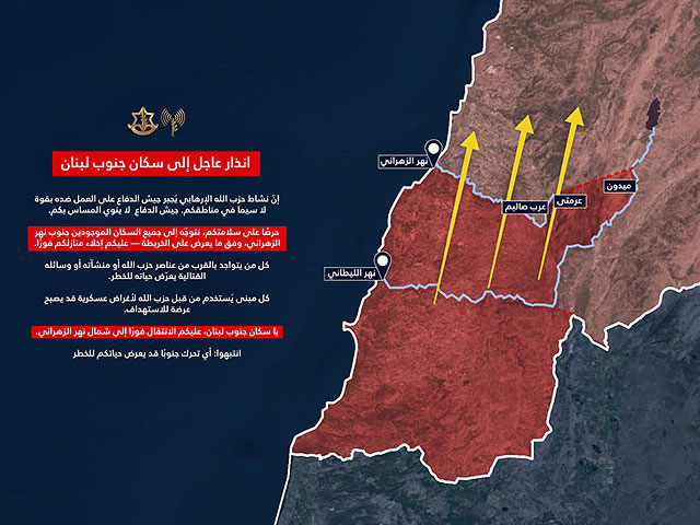 Официальный представитель пресс-службы ЦАХАЛа на арабском языке полковник Авихай Эдраи опубликовал обращение к жителям юга Ливана с призывом эвакуироваться в районы, находящиеся севернее реки Захрани.
