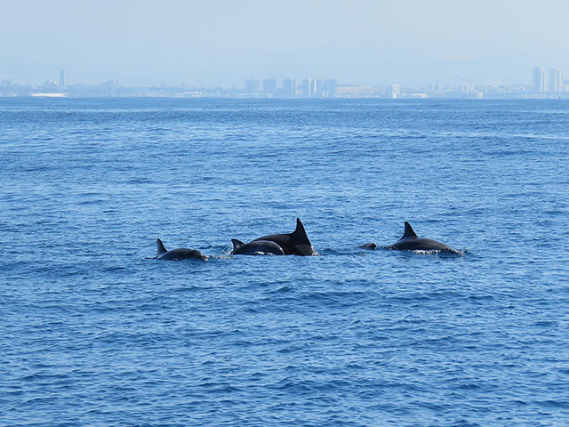 Инспекторы морского подразделения Управления природы и парков во время патрулирования в Хайфском заливе заметили редкую для этого района стаю из пяти афалин (Tursiops truncatus), в том числе двух детенышей.