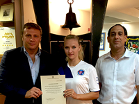 Депутат Кнессета Константин Развозов ("Еш Атид") вручил в Реховоте грамоту за особые достижения в спорте члену сборной Израиля по ушу Анастасии Кирилюк, завоевавшей в мае этого года медали чемпионата Европы.