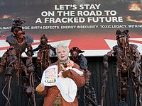 Известная британская дизайнер Вивьен Вествуд устроила акцию протеста против планов правительства Великобритании о добыче нефти и газа из горючих сланцев. Она приехала к дому премьер-министра Дэвида Кэмерона на танке.