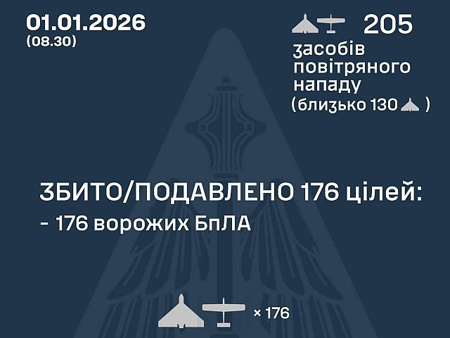Генштаб ВСУ сообщает, что ночью 1 января 2026 года российские военные выпустили по Украине 205 БПЛА-камикадзе "Shahed-136/131" ("Герань-2/1") и беспилотников других типов. Украинские ПВО заявляют о перехвате 176 БПЛА, запущенных российскими военными. Зафиксированы попадания 24 ударных БПЛА в 15 локациях. Причинен значительный ущерб в Харьковской и Одесской областях.