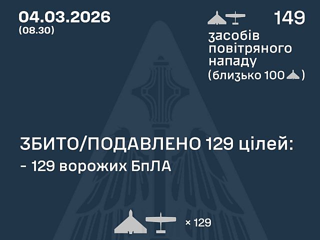 Генштаб ВСУ сообщает, что ночью 4 марта 2026 года российские военные выпустили по Украине 149 БПЛА-камикадзе и беспилотников других типов. Украинские ПВО заявляют о перехвате 129 БПЛА, запущенных российскими военными. Зафиксированы попадания 19 ударных БПЛА в 15 локациях и падения фрагментов в 1 локации.